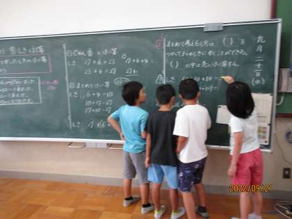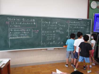算数科の授業では、「式と計算」で( )を使った計算を学習しました。( )のある式は( )の中から先に計算しないといけないというルールを知って「ふしぎだ」「( )って強いな」「前から知ってたで」と様々な声が聞こえました。