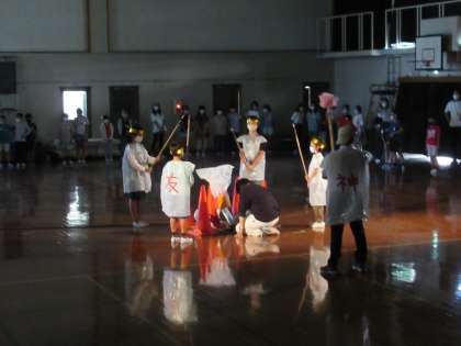 残念ながら,若狭湾自然の家宿泊学習は中止になりましたが,準備してきたことをいかして体育館でキャンプファイヤーを行いました。レク係が中心となり,みんなとても楽しみました。火の神も岩倉南小学校まで来てくださいました!!思い出に残るものになりました!
