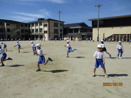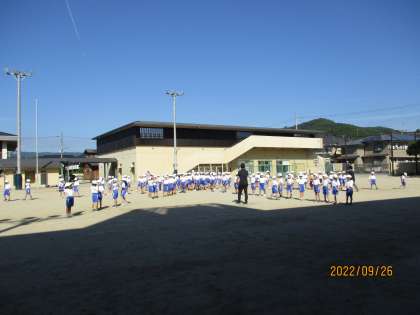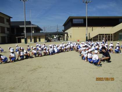 4クラスそろって運動場に出て、2回目のダンスの練習をしました。立ち位置などを確認しながら、見本のダンスを見なくても踊れるように練習を始めています。移動を駆け足でしっかりと移動したり、声を掛け合って位置を確認したりと積極的に動く姿勢が見られます。大きく手足を動かしたり、細かい所を合わせたりしながら、本番まで頑張って練習していこうと思います。