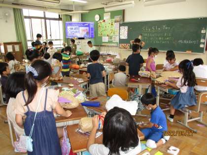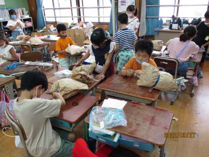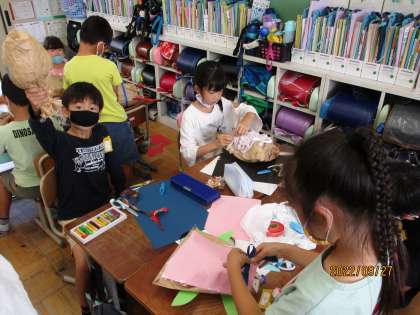 クラフト紙を袋の形にして、新聞紙を詰めたものを自分たちの思いのままにくしゃくしゃぎゅっとしました。その形を見て想像したものを作ったり、くしゃくしゃしながら作りたいものに形を近づけていったりして作品を作りました。リボンやモール、色画用紙などを使って工夫して飾りつけもして、猫やカメ、花束、ラグビーボール、新幹線などそれぞれの想いが詰まった作品が仕上がりました。たくさん図工の用意してくださってありがとうございました。