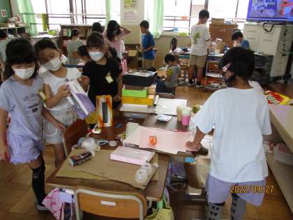 1年生を招待するために、実際に遊んで色々な発見をしながら、遊びの設計図を書き進めています。自分が1年生を招待したい遊びの種類(ころがす、とばす、はじく等)を選んで班に分かれ、班ごとに遊び方や遊びのルールを細かく決めています。「もっとこうしたらいいんじゃないか」「こうした方がおもしろいんじゃないか」と声を掛け合いながら1年生に楽しんでもらえるように考えています。どんなものが出来上がるのかとても楽しみです。