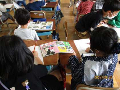 国語科の授業では、マイお仕事図鑑を作っています。「どうぶつ園のじゅうい」で学習した獣医さんの仕事の工夫やわけ(理由)をヒントにして、ほかの職業の仕事の工夫やわけ(理由)を探しています。水族館や動物園の飼育員さん、獣医さん、花屋さんなどたくさんの仕事の中から自分の興味がある仕事を選んで楽しそうに図鑑を作っています。完成間近なので完成が楽しみです。