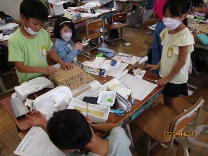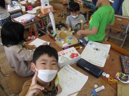 いよいよルールや遊び方、得点などを考えながら廃材を組み立てて、1年生を招待するための遊びづくりが始まりました。設計図を描き進めながら「こっちのほうがいいんじゃないか」「新しく○○が必要ではないか』と自分たちで実際に遊んだり、試したりして考えながら一生懸命進めています。