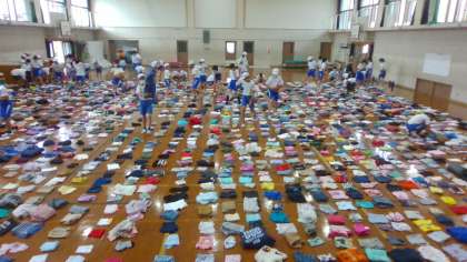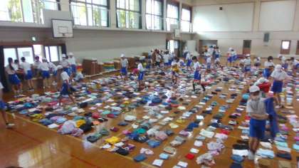 学年で協力して服の分別を行っています。