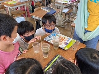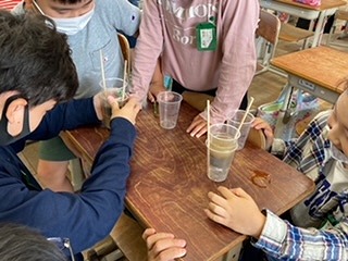 理科では「雨水のゆくえ」では、雨が降った後、地面にたまった水はどこにいくのかについて学習しています。子どもたちの「地面にしみているのではないか」という予想をもとに、実験をして確かめてみました。透明なコップを使って実験をしてみると、水が土にしみていく様子がよくわかりました。子どもたちは「やっぱりしみていた!」と、実験してわかったことを話していました。
