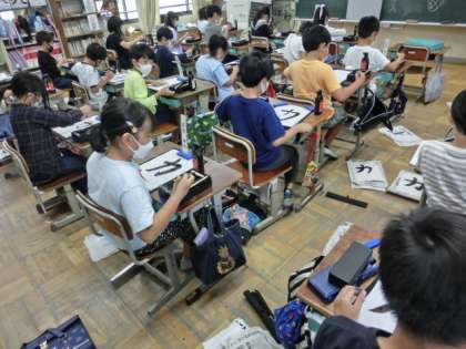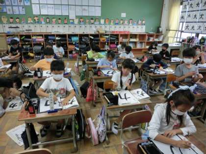 今日の書写の学習では、「おれ」や「はね」に気をつけて「力」を書きました。また名前も小筆を使って丁寧に書いていました。