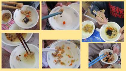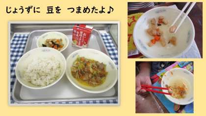 2年生の教室をのぞいてみると、おはしを上手につかって五目煮豆の豆をつまんで食べていました。すごいですね!!