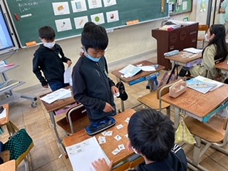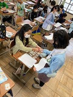 外国語活動では、お店とお客さんに分かれ「Do you have 〜?」を使ってやり取りをしました。欲しい文房具を置いているお店の友達に「Do you have a pen?」と尋ねたり、お客さんの友達に「Yes,I do.」と答えたりしました。