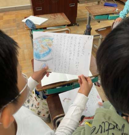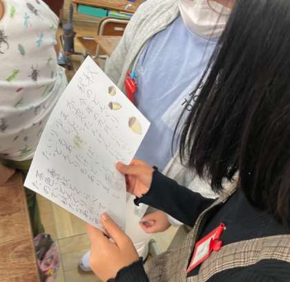 国語科「きせつの言葉」では、秋を感じる言葉を集め、季節のカードをつくりました。虫の声や、緑から赤色に移り変わるもみじの色、くりごはんのいい香りなど、秋を感じる瞬間は人それぞれであることを交流して気づいたようです。