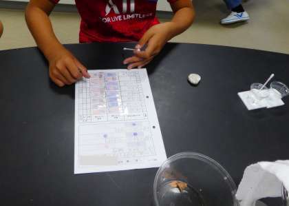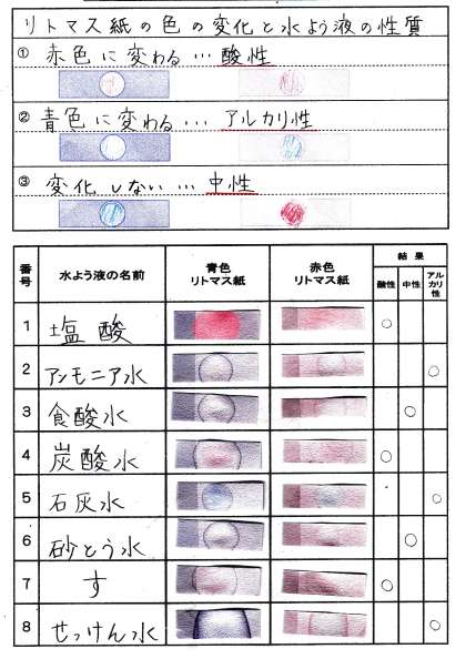 前回準備したリトマス紙用のノートを使い,8種類の水よう液について調べました。