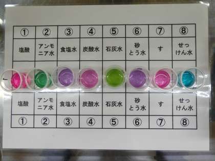 前回に続いて8種類の水よう液について,酸性・中性・アルカリ性を調べました。