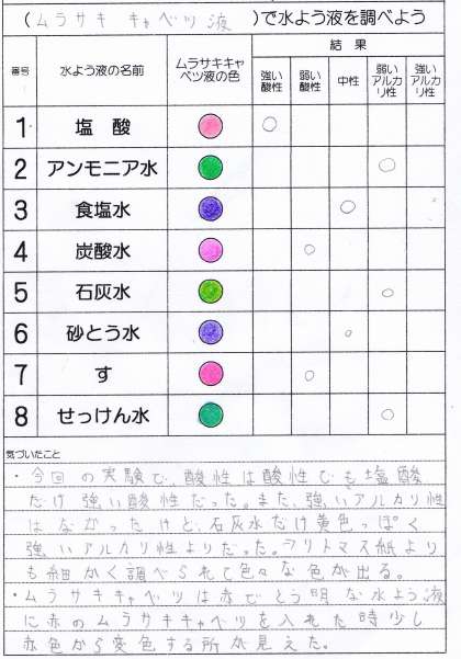 理科だより6年「ムラサキキャベツ液で水よう液を調べる。」