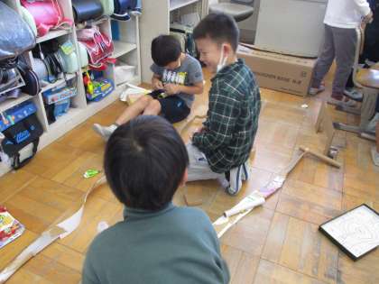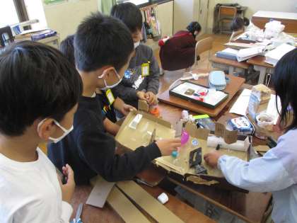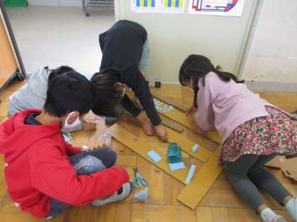 学年で遊びあってみんなからもらったアドバイスをもとに遊びの改良を行っています。障害物をふやしたり、簡単なコースと難しいコースの2つのコースを作ったり、かわいく装飾したりなど貰ったアドバイスをフルに活用してより楽しくなるように考えて作っています。