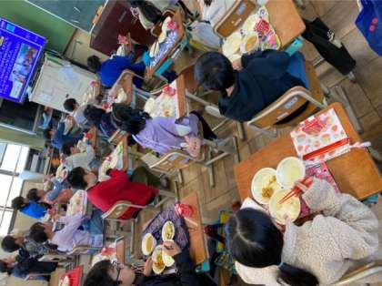 今日の給食は、新しいメニュー「根菜のかきあげ」でした。「新メニューだ!」「よく噛むと根菜の味がよくしたよ。」と、子どもたちは味わいながら喜んで食べていました。