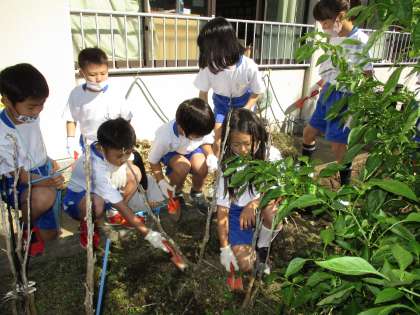 5月に植えたオクラとピーマンの最後の観察をしました。観察の視点で目、耳、鼻、手を最大限に使って観察をして、子どもの中には初めのころと比べた様子を観察カードに書いている子もいました。オクラはすっかり枯れてしまいましたが、ピーマンは最後まで頑張って実をつけてくれていました。観察が終わった後は、みんなでオクラとピーマンを抜いて、冬野菜を植えるのに向けて土を均しました。根っこの様子を最後に見ることができて子どもたちはとても驚いていました。