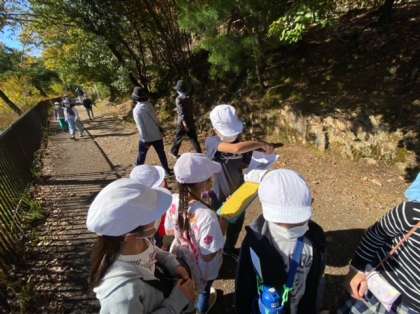 今日はたてわり遠足でした。とてもいいお天気で、2年生と協力しながらクイズに取り組んだり、どんぐりを集めたりしました。