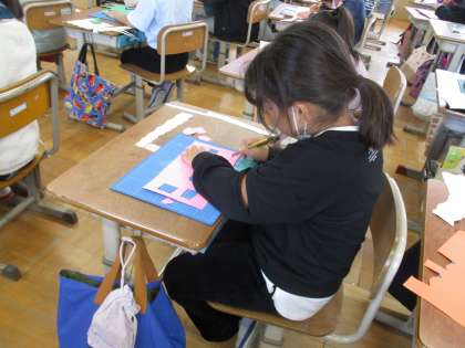 図画工作科の授業では、光のプレゼントでカッターナイフを使っています。まずはカッターナイフを安全に使うことができるように画用紙を切る練習をしました。鉛筆持ちをすること、刃の出し方、立て方、手の置く位置、紙を動かして切ることなど安全に使うために細かく指導をしました。安全に気を付けて、きれいな作品が作れるように学習を進めていこうと思います。