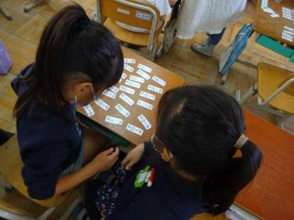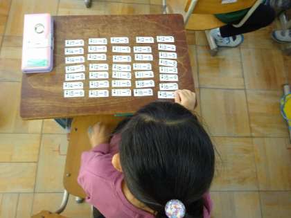 算数では、くりさがりのあるひき算を学習しています。引き算カードも、スピードアップできるよう、楽しみながら学習しています。