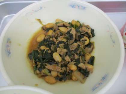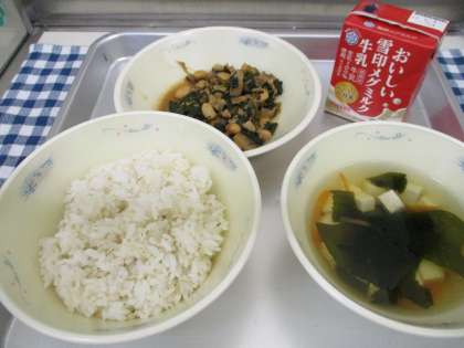 今日の肉みそいためは、にんにくや八丁みそをつかっていて、ごはんに合う味でした。こんにゃくや大豆の食感を楽しめる献立でした。