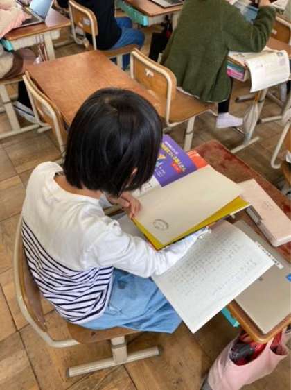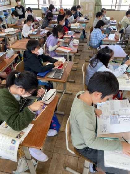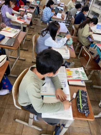 国語科では、伝統工芸のよさを伝えるためにリーフレット作りをしています。本やインターネットを使って伝統工芸について調べ、それぞれのよさについて考えています。