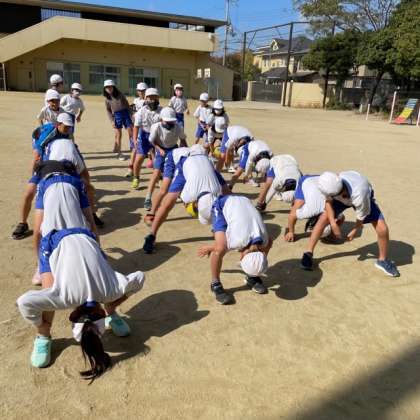 ボールを用いた体ほぐしの運動です。グループ対抗ボールリレー、どのグループが一番はやく回せるか盛り上がりました。