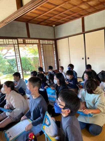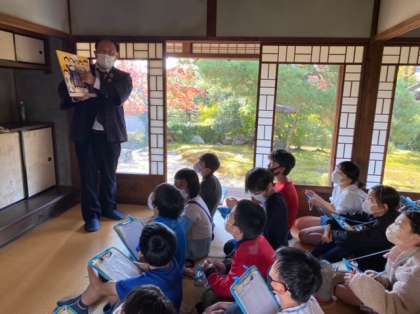 総合的な学習の時間「これからの岩倉」の学習で、岩倉の伝統について学習し、岩倉具視について調べています。今日は、昔、岩倉具視が住んでいた岩倉具視幽棲旧宅へ行きました。岩倉具視がなぜ岩倉に住むことになったのか、岩倉でどのように暮らしていたのかを紙芝居を使って教えていただきました。