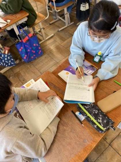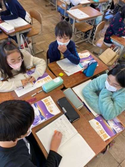 算数科「がい数とその計算」の学習で、がい数の表し方について考えました。「4までの数は0に近くて、5より大きい数は10に近い。」「千の位までのがい数に表すためには、一つ下の百の位で四捨五入しないといけない。」と話し合いました。
