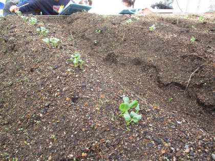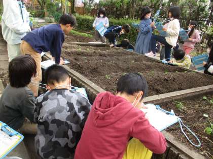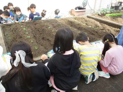 冬野菜でまいた大根の種もだんだん芽を出し始めました。オクラとピーマンの葉っぱとの違いや葉っぱがハートの形に見えることをとても驚いていました。これからどんどん大きく育ってくれるのが楽しみです。