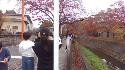 理科「季節と生き物」では、春から観察している生き物の様子を観察しています。サクラを見に行くと、夏とは様子がずいぶん違っていました。「葉の色が変わっている。」「えだに葉がほとんごなかった。」と夏とのちがいを見つけていました。