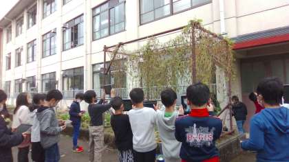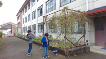 「夏にできていた実がなくなっている!」「なんだか元気がないな。」と夏のツルレイシとのちがいを発見。ツルの高さにあまり変化はありませんでしたが、色や様子がちがうところがたくさんありました。子どもたちは、生き物の様子からも秋を感じているようでした。他の生き物の様子も観察していく予定です。