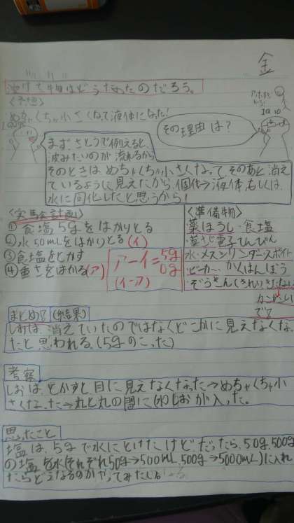 食塩は水にとけると,目に見えない小さなつぶになって,水全体に広がっていく。