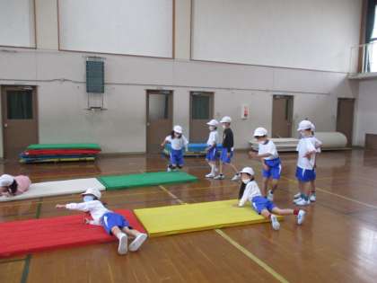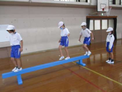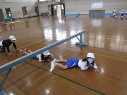 体育科の授業の「まねっこあそび」では、平均台を上ったり、マットを転がったり、高い平均台をくぐったりするのですが、1番のポイントは前の人の動きをまねすること。4人のグループを作り、前の人がした動きをまねて歩いたり、転がったりしています。前の子もおもろく工夫してみたり、後ろも楽しそうにまねをしたりと声をかけあって楽しく活動しています。
