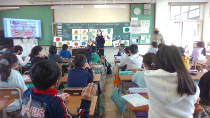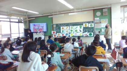 今日の外国語活動は、ALTのルイス先生と一緒に「What do you want?」を学習しました。ピザやパフェづくりをするために、欲しい野菜や果物を尋ねたり答えたりすることを学習します。ルイス先生と一緒に英語での言い方を確かめたり、ゲームをして慣れ親しんだりしました。