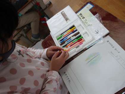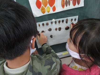生活科の時間に見つけたどんぐりを図鑑のどんぐりと比べています。「このどんぐりに似てる!」「名前は…?」と興味津々です。見つけた綺麗な落ち葉も、クーピーで写しました。たくさんの秋を見つけましたね。
