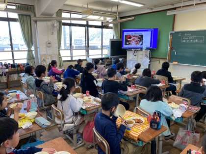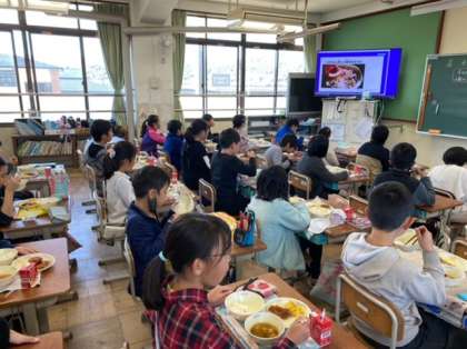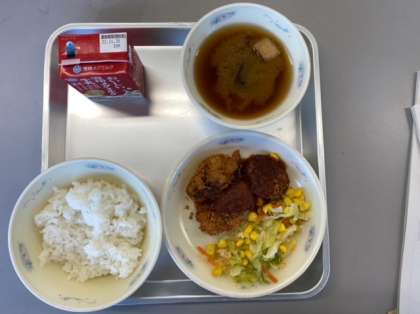 今日の給食は、子どもたちが楽しみにしていたヒレカツです。「お肉がやわらかくておいしい!」「手作りソースとごはんがよく合うね。」と嬉しそうに食べていました。