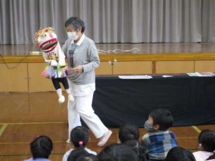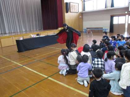 1年生の歯磨き巡回指導がありました。学校歯科医の金田先生と歯科衛生士の安井先生が指導をしてくださいました。もう…楽しすぎて!!子どもたちは前のめりになり、大笑いしながら話を聞いていました。まずは、マジックで子どもたちの心をつかみ、人形劇をして、途中で虫歯菌に扮した謎の人が登場し…子どもたちは、もう話に夢中です。きちんと整列して座っていたはずなのに、どんどんと前へと近づいていました。