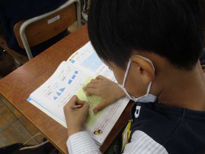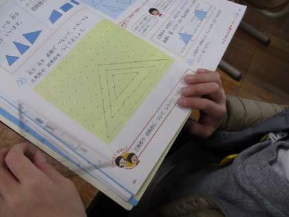 算数科の授業では「三角形と四角形」の学習に入りました。今日は3本の直線で囲まれている形を三角形、4本の直線で囲まれている形を四角形ということを学習し、自分たちで三角形と四角形を書いてみました。子どもたちはそれぞれの大きさや形を書いていてとても面白かったです。三角定規のご準備ありがとうございました。