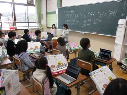 繰り返しを使って音楽をつくり、そのリズムで和太鼓をたたきました。「ドンドン」「ドコドン」「ドン(ウン)」などさまざまなリズムから自分の打ちたいリズムをつくりました。子どもたちはとても楽しそうに和太鼓でリズムうちをしていました。和太鼓をたたく機会もそれほどないと思うので、またおうちで感想を聞いてあげてください。