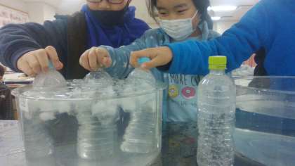 理科の学習で、空のペットボトルを湯や氷水の中に入れた時のペットボトルの様子について話し合いました。「お湯に入れるとペットボトルがぱんぱんにふくらんだよ。」「氷水の中に入れると、ペットボトルがどんどんへこんでいった!」ということから、ペットボトルの中にある空気の体積とお湯や氷水の温度が関係あるのではないかと子どもたちは考えていました。これからものの体積と温度の関係について調べていきます。