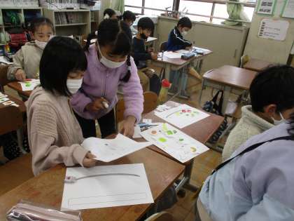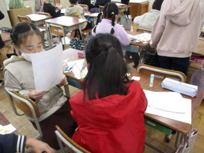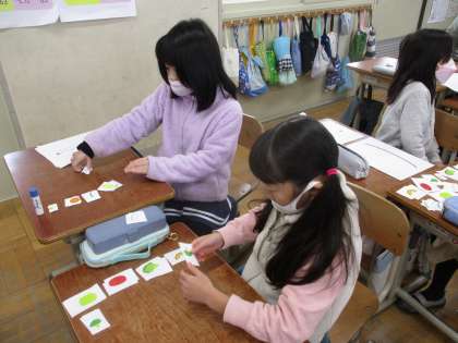 自分で考えた「〇〇のための△△サラダ」にするために、今日は八百屋さんとお客さんに分かれて野菜を集めました。「〇〇,please.」「How many?」「Two 〇〇,please.」「Thank you.」と上手にやり取りをしてスペシャルサラダを完成させていました。次の時間にはクラスのみんなに向けて発表するので、だれのためにどんなサラダを作ったのか、発表を聞くのが楽しみです。