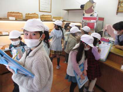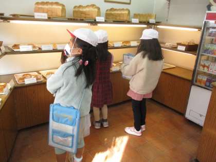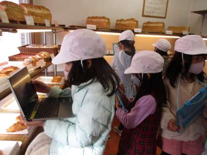 焼き立てパンの店バルブさんでは、パンが並んでいる様子や、中でパンが実際に作られている様子見せていただきました。パンのにおいを嗅ぎながら楽しそうにメモをしたり写真を撮ったりしていました。金曜日が最後の探検なので最後まで安全に気を付けて探検に出かけます。