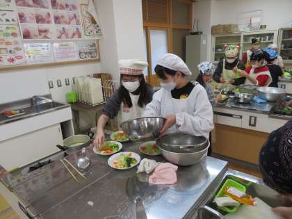 家庭科の学習で「ゆでる」学習をしました。にんじん、キャベツ、ブロッコリーをゆでて,カラフルコンビネーションサラダを作りました。前回の調理実習よりもテキパキと動き、おいしいサラダが出来ました。