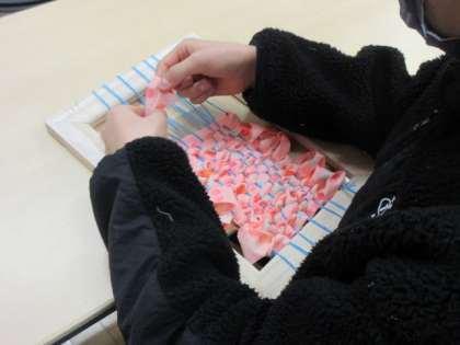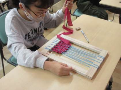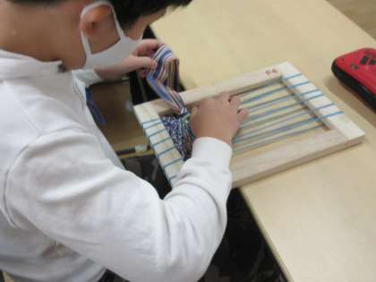 専用の枠に、布を通してそれぞれ自分オリジナルの布を織りました。