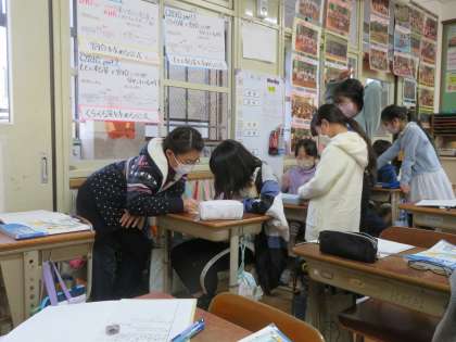 お互いに教え合って学習を進めています。今日の算数の割合の学習では,全員理解を目指して,子どもたちが先生になって教え合っていました。