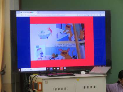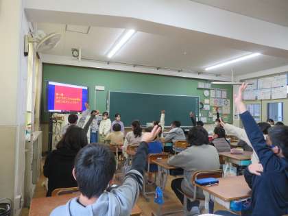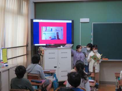 係の活動で,朝に読聞かせとクイズをしてくれました。本ではみんなが見えにくいだろうと考えプレゼンソフトを使ってスライドまで用意しています。読聞かせの後のクイズはみんなで盛り上がれるようなクイズでした。