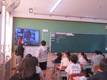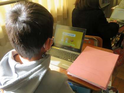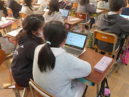 外国語科の学習でもGIGA端末を使っています。やり取りの方法を確かめるために個人でチャンツを聞いたり,言いたい単語を調べたりしています。