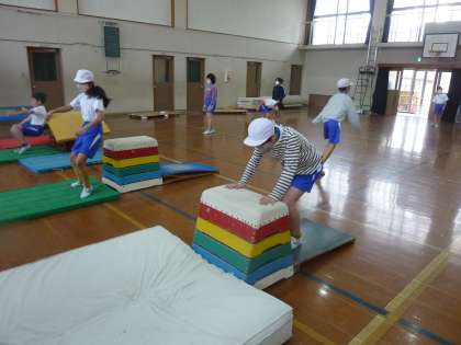 先週の体育科「とび箱」の様子です。さまざまな跳び方に挑戦しました。初めは,跳べなかった段数や跳び方も練習を重ねることで,跳べるようになり,喜んでいる姿がたくさん見られました。