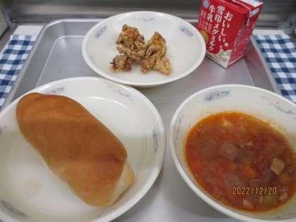スパイシーチキンは、カレー粉やにんにく、ヨーグルトをつかったスパイシーなタレにつけこんだ鶏肉を油であげて作ります。サクサク、カリっとしたスパイシーチキン。心の弾む献立でしたね。給食前からいいにおいが広がっていたので、4時間目からおなかがグ〜ッとなっていた人も多かったのではないのでしょうか?