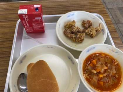 今日の献立はスパイシーチキンとミネストローネでした。少し早めのクリスマスを感じながら、子どもたちは喜んで食べていました。