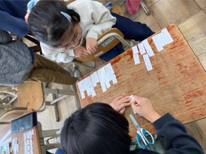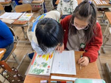 国語科「感動を言葉に」では、最近身の回りで心を動かされた出来事を題材にして詩を考えています。詩に使う言葉の順番を考えたり違う言葉に変えたりしながら、よりよい詩になるようにアドバイスし合いました。